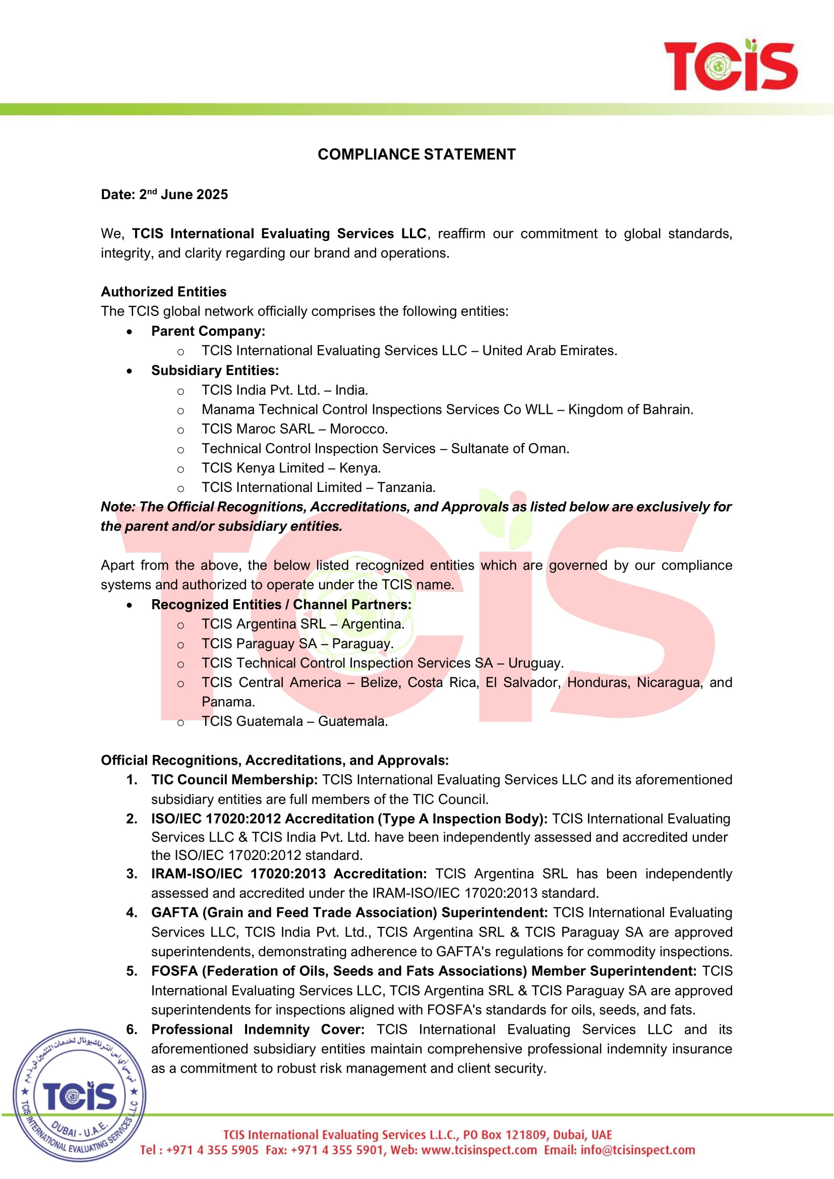 TCIS is committed to delivering professional excellence. "As a company, we believe in honouring our contractual and business obligations by giving the right value to our clients' requirements and by adopting the highest professional and ethical standards."